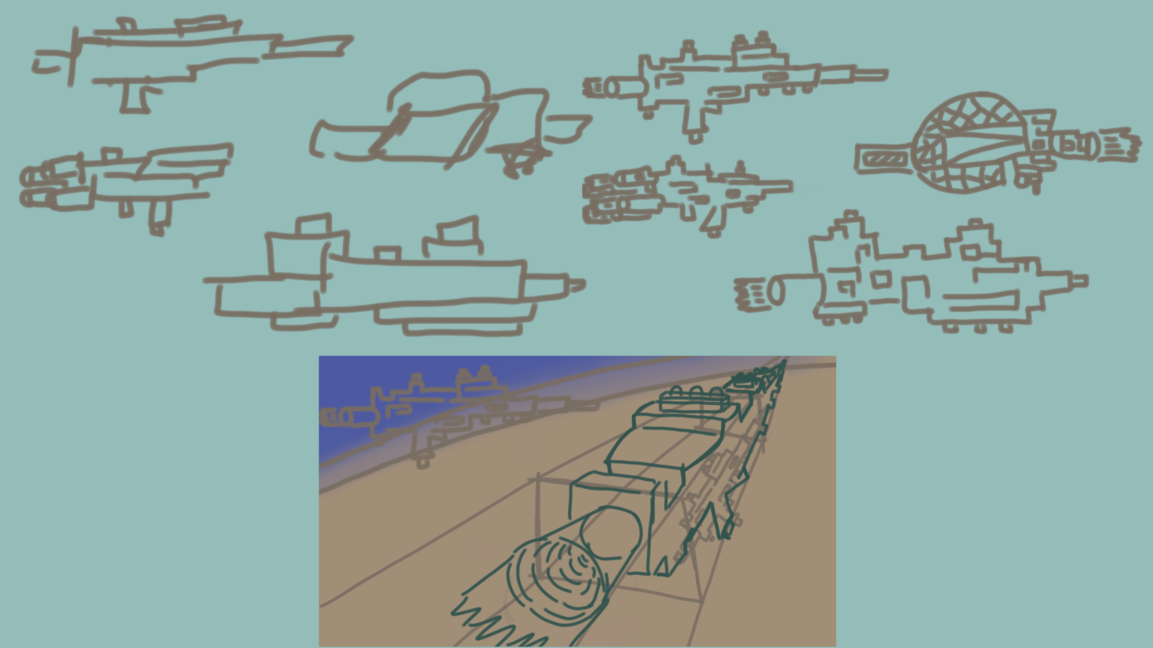 Onto the the more pertinent musings - here's the sketch process of one of ship types that the main character, the daughter of a pirate Lady, now named Pershea. Available for the player, are, up-bottom, right left, a standardised space! battlecruiser, a converted space! light cruiser into an escort carrier, a cutting-edge space! destroyer, and an old and greying space! battleship, back when the turrets only rotated 90 degrees.